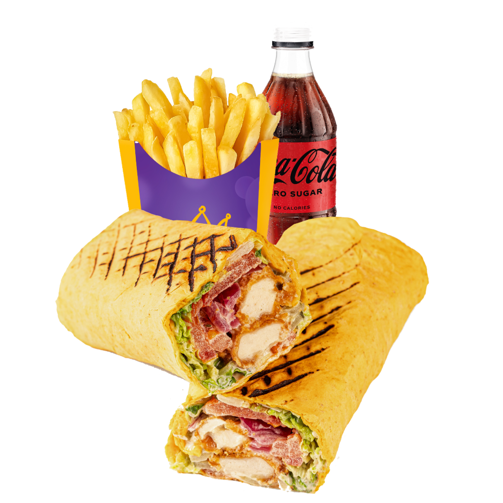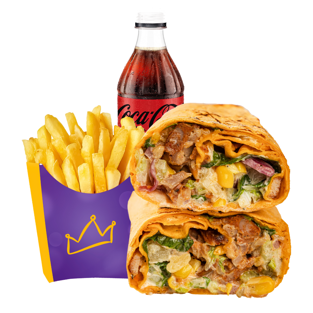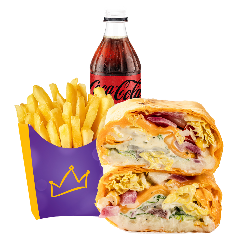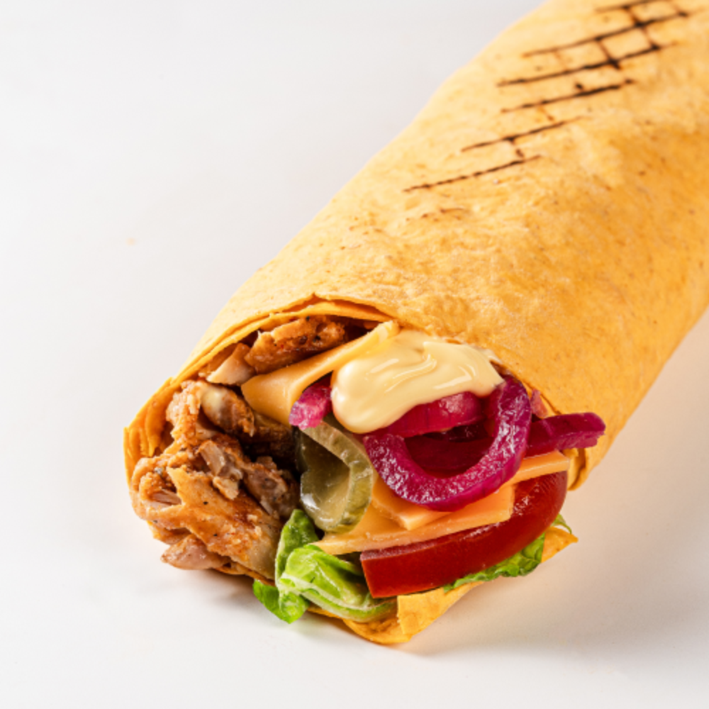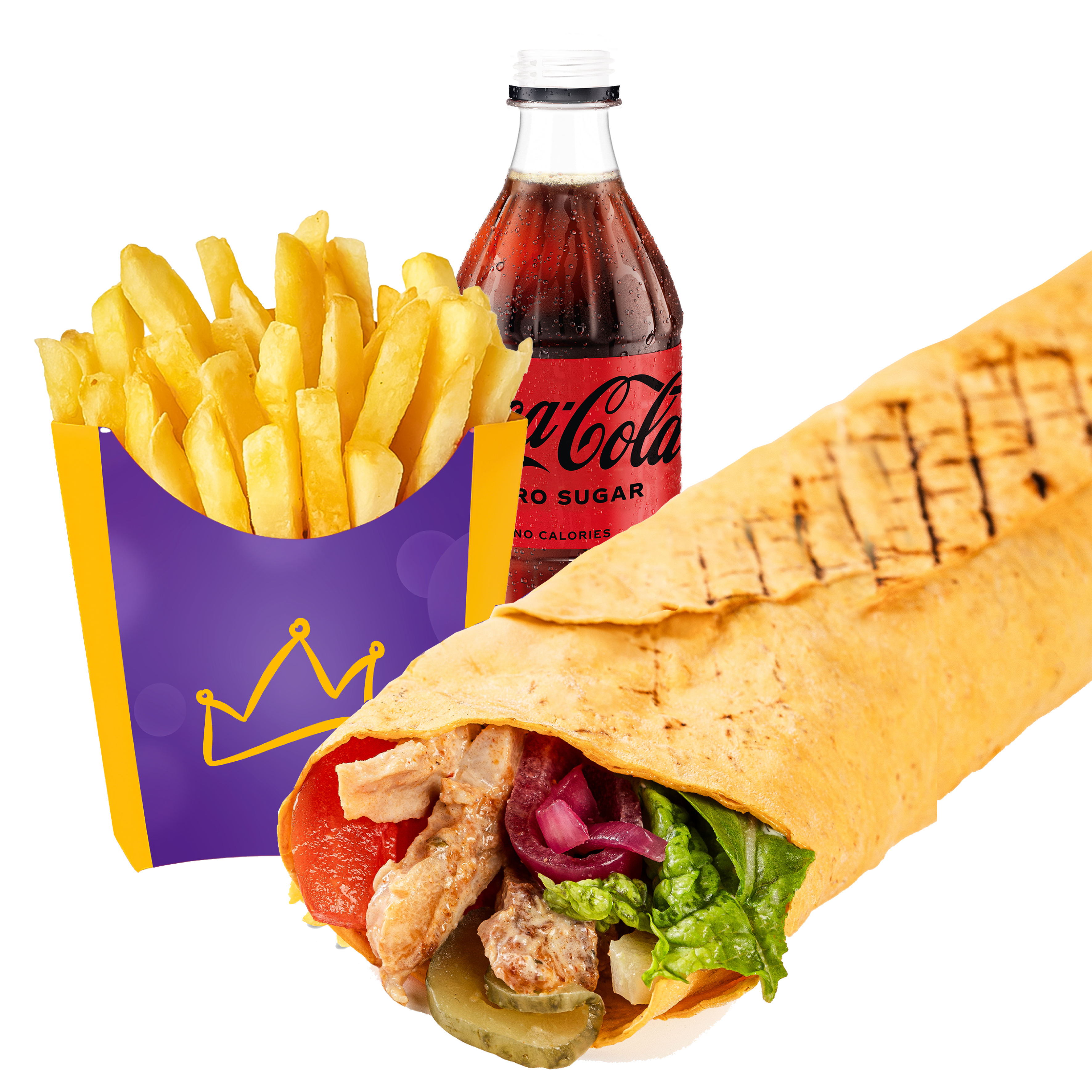 Junior Kids Kebab складається з хрусткого лаваша, мікс салату (без цибулі), маринованих огірків, соковитих нагетсів і авторського соусу на основі йогурту